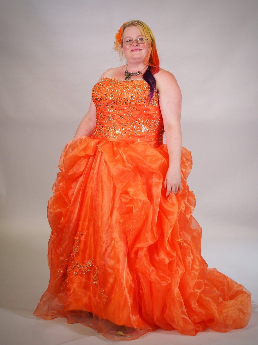 White woman with glasses in a bright orange glittery ball gown with a fluffy skirt.